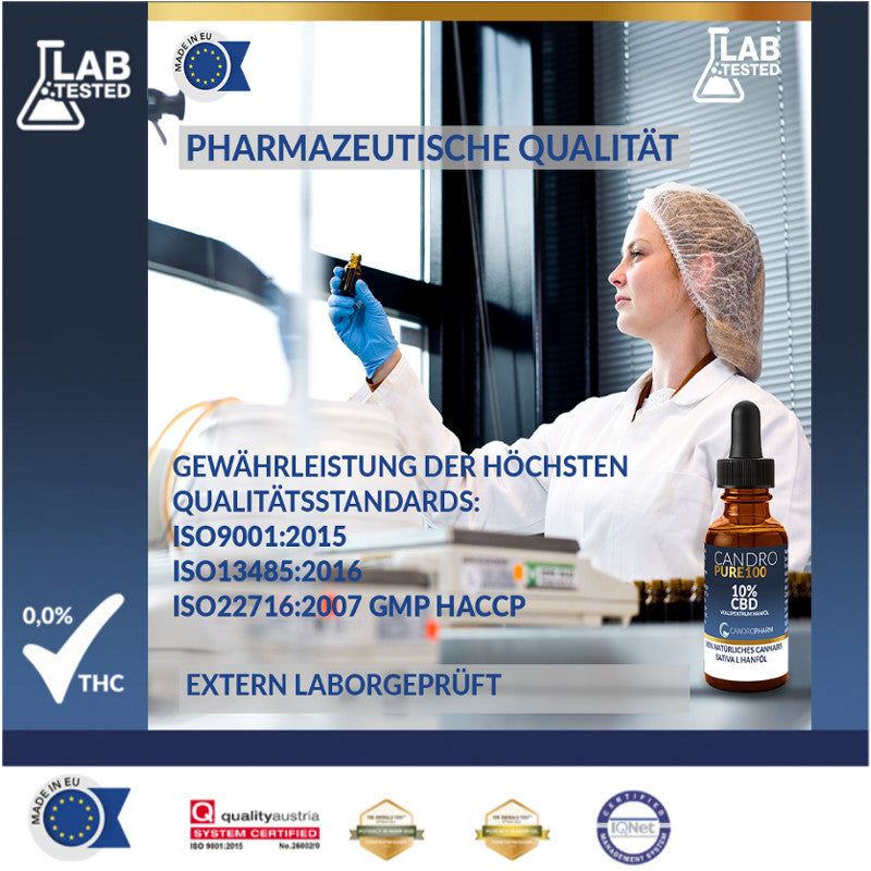 Entdecken Sie die natürliche Kraft von unserem hochprozentigen CandroPure300 mit mindestens 30% CBD aus Vollspektrum Extrakt. Das CandroPure300, ein Premium Vollspektrum CBD Öl, das sorgfältig entwickelt wurde, um Ihr tägliches Wohlbefinden zu unterstützen. Der THC Anteil liegt unter 0,1% und ist damit nicht nachweisbar.
